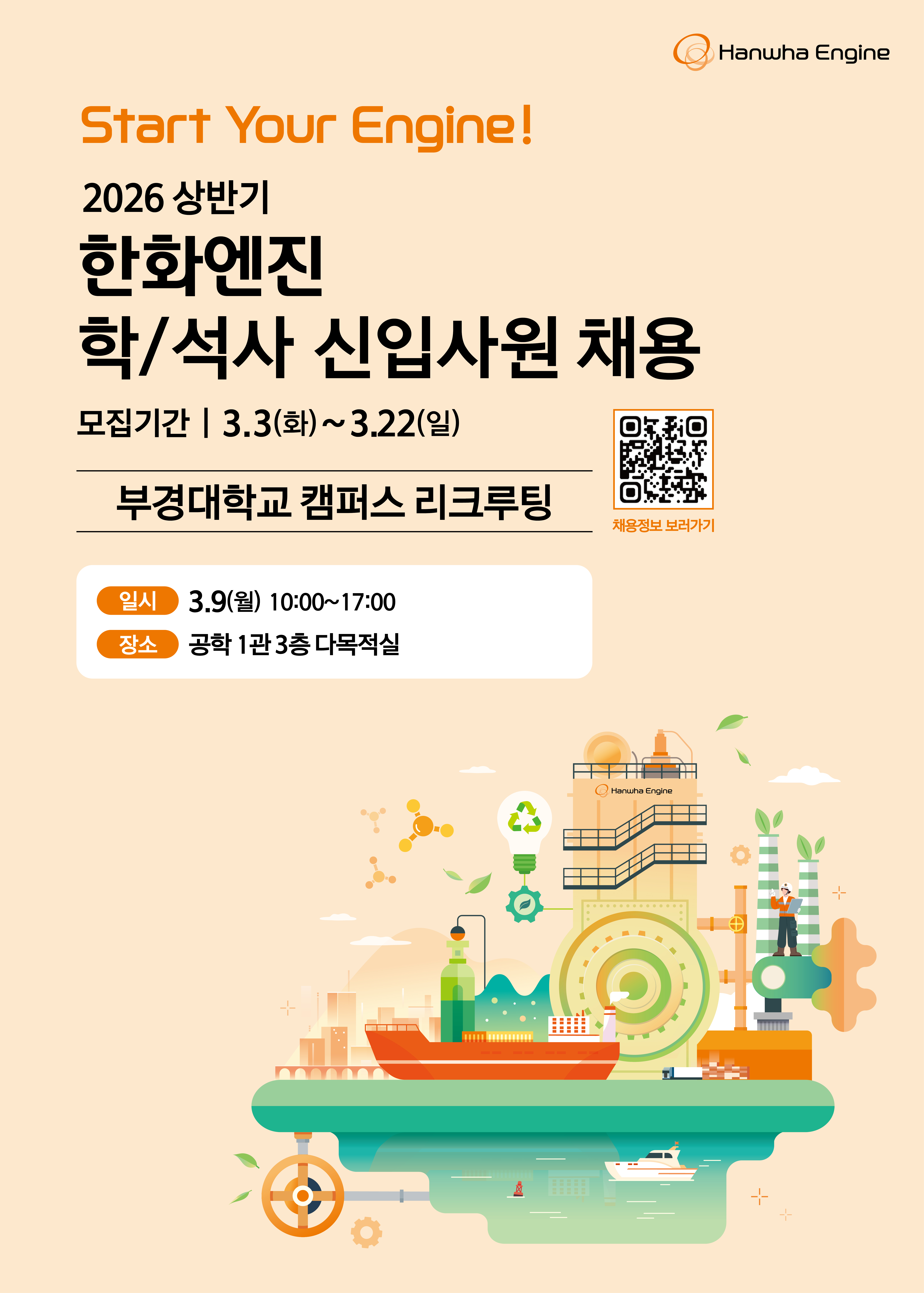 2026 상반기 한화엔진 학/석사 신입사원 채용 [한화엔진] 2026 상반기 한화엔진 부경대 캠퍼스 리크루팅 3/9(월) 한화엔진이 부경대 여러분을 찾아갑니다! - 일시: 3/9(월) - 상담회: 공학 1관 3층 다목적실 / 10:00 ~ 17:00 <2026 상반기 한화엔진 학/석사 신입사원 채용> - 모집기간: 2026.03.03(화) ~ 03.22(일) - 모집분야 : 관리회계/재무회계, IT 기획/운영, 영업(엔진영업/AM영업), 프로젝트 엔지니어링, 생산기술, 시운전기술, 설계(제품설계/제어설계), R&D, 품질, 구매, 안전환경 - 지원방법: 한화엔진 홈페이지를 통한 온라인 지원 한화엔진에 대해 더 자세히 알고싶다면? https://hanwhaengine-recruit.com/