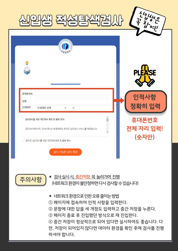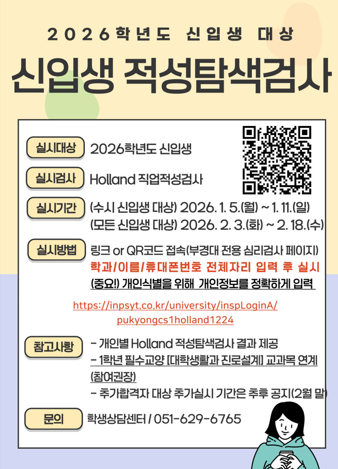 신입생 적성탐색검사 온라인 실시 및 실시방법 안내 학생상담센터에서는 2026학년도 신입생들의 진로발달을 위해 적성탐색검사를 실시하고자 하오니 2026학년도 신입생은 실시기간 내 검사를 완료할 수 있도록 협조 부탁드립니다. 가. 실시기간: (수시 신입생 대상) 2026. 1. 5.(월) ~ 1. 11.(일) (모든 신입생 대상) 2026. 2. 3.(화) ~ 2. 18.(수) 나. 실시방법 - 심리검사 링크에서 학과, 성명, 휴대폰번호 입력 후 온라인 심리검사 실시 다. 주요내용
