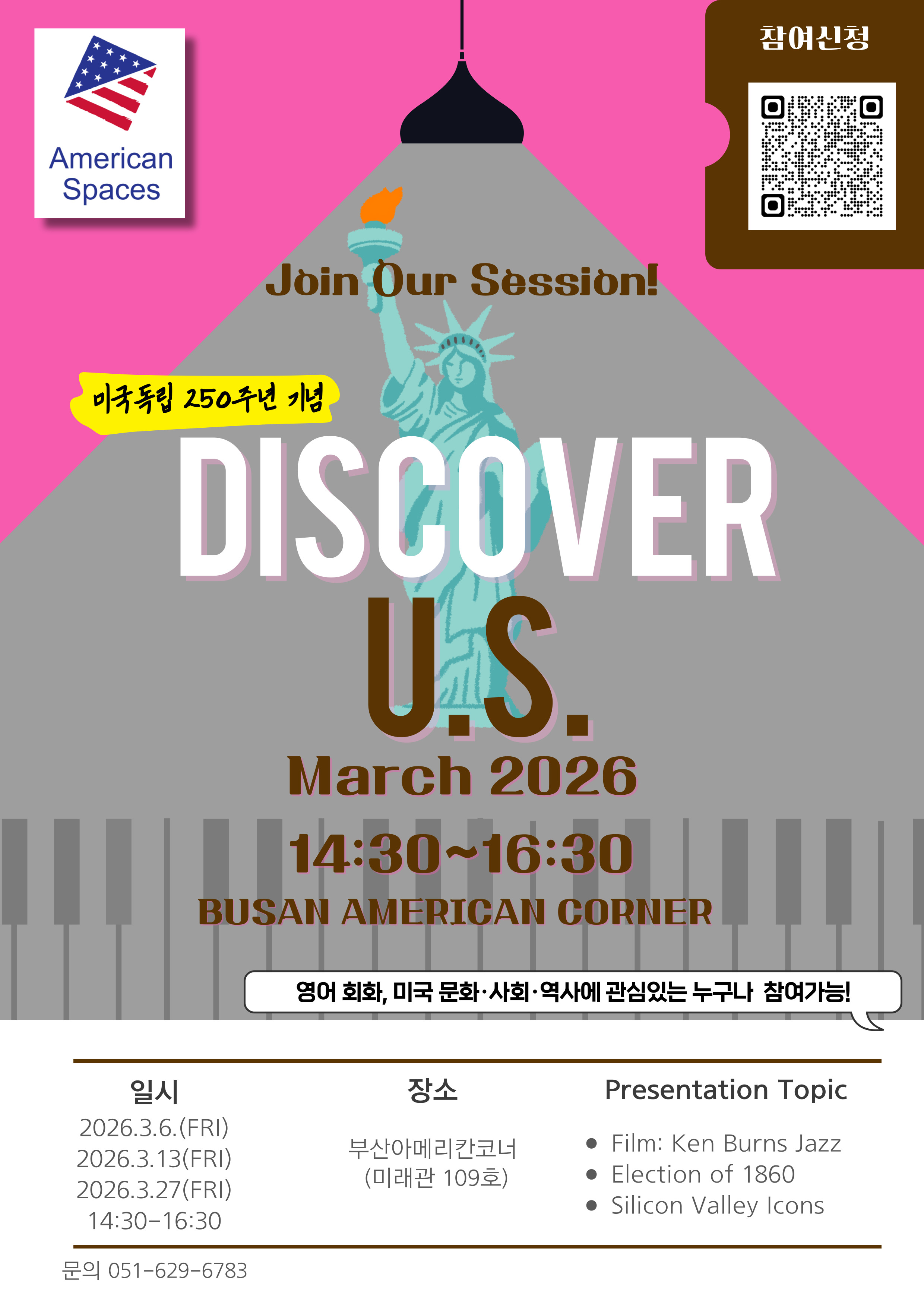[부산아메리칸코너] Discover U.S. 3월 프로그램 홍보 글로벌어학교육센터에서 미국 독립 250주년을 기념하여 진행되는 부산아메리칸코너-주한미국대사관 협력 프로그램 「Discover U.S.」3월 특강에 관심 있는 학생들의 많은 참여 바랍니다.