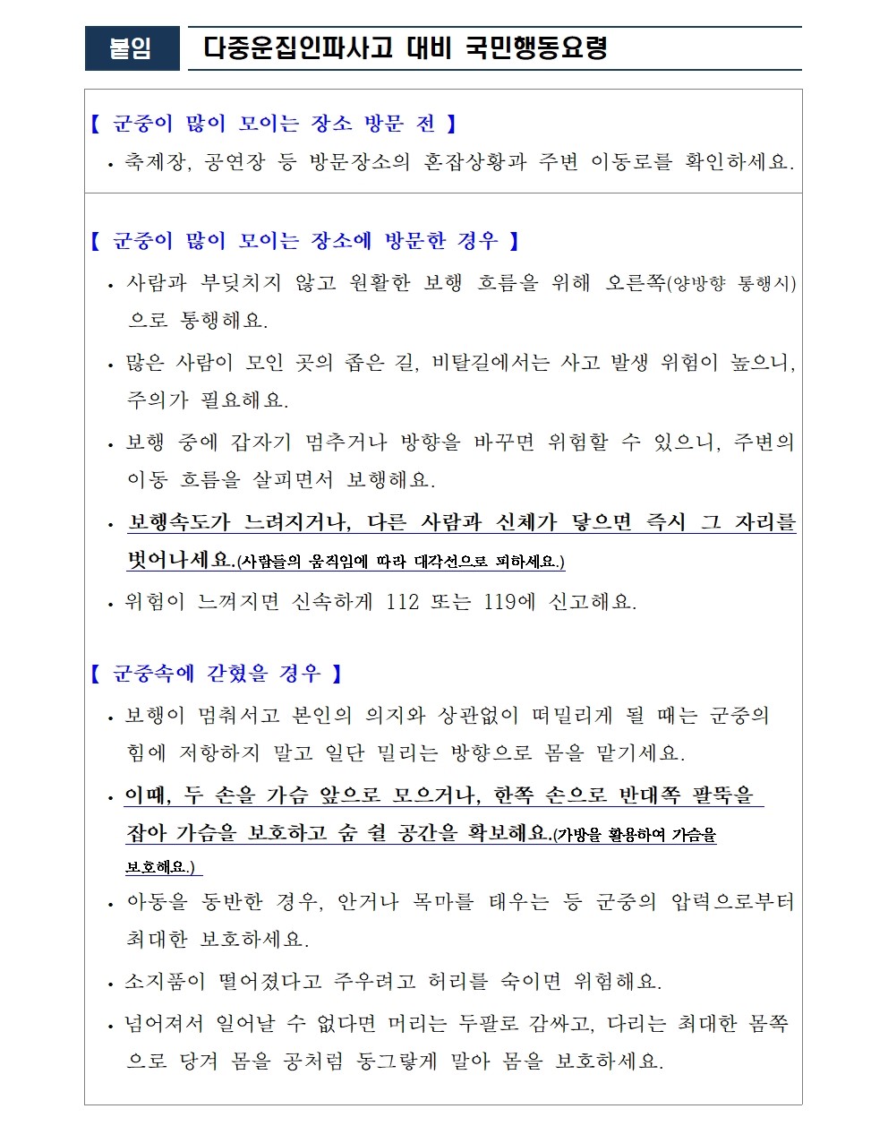 봄철 대규모 행사 참여 관련 학생 안전사고 예방 봄철 대규모 민간공연, 지역축제, 스포츠 경기 등 다양한 행사가 활발해짐에 따라, 학생 개인이 자율적으로 참여하는 다중운집 행사에서의 인파사고 발생 우려가 높아지고 있습니다. 이에 개인적인 외부 활동 중에도 안전을 확보할 수 있도록 「다중운집 인파사고 대비 국민행동요령」을 안내하니, 행사장 주변 야간대기 및 노숙 등 안전 취약 행동을 자제하여 주시기 바랍니다.