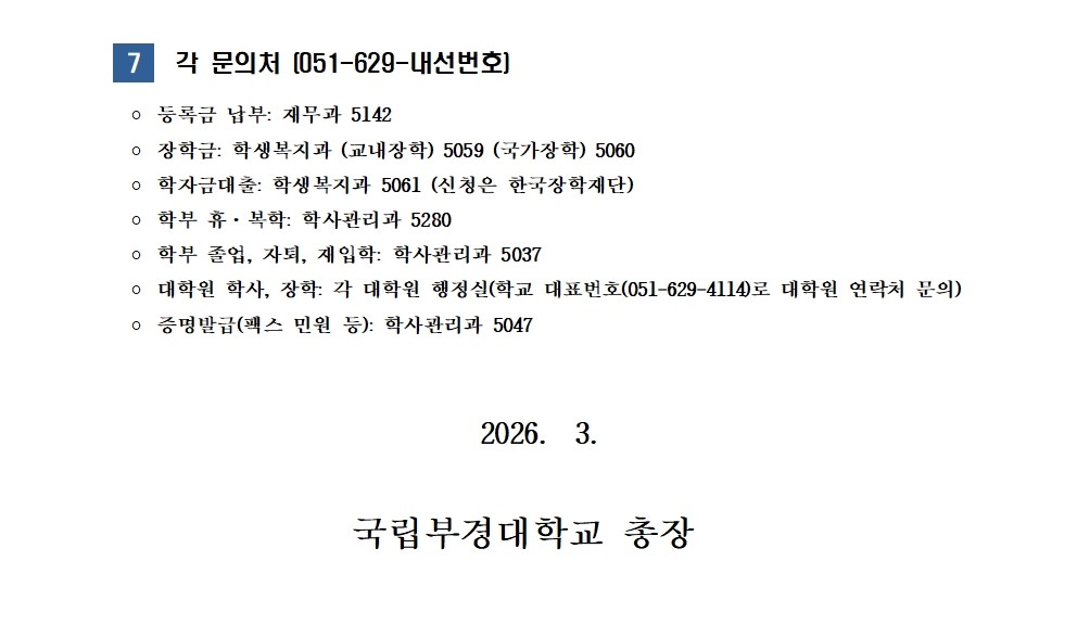 | 첨부파일 | (붙임2)등록금 고지서 조회방법 안내.pdf (붙임4)2026학년도 등록금 내역(국립부경대학교).xlsx (붙임5)2026학년도 신청학점별 차등감면 등록금 내역(수업연한경과자).xls | ||
