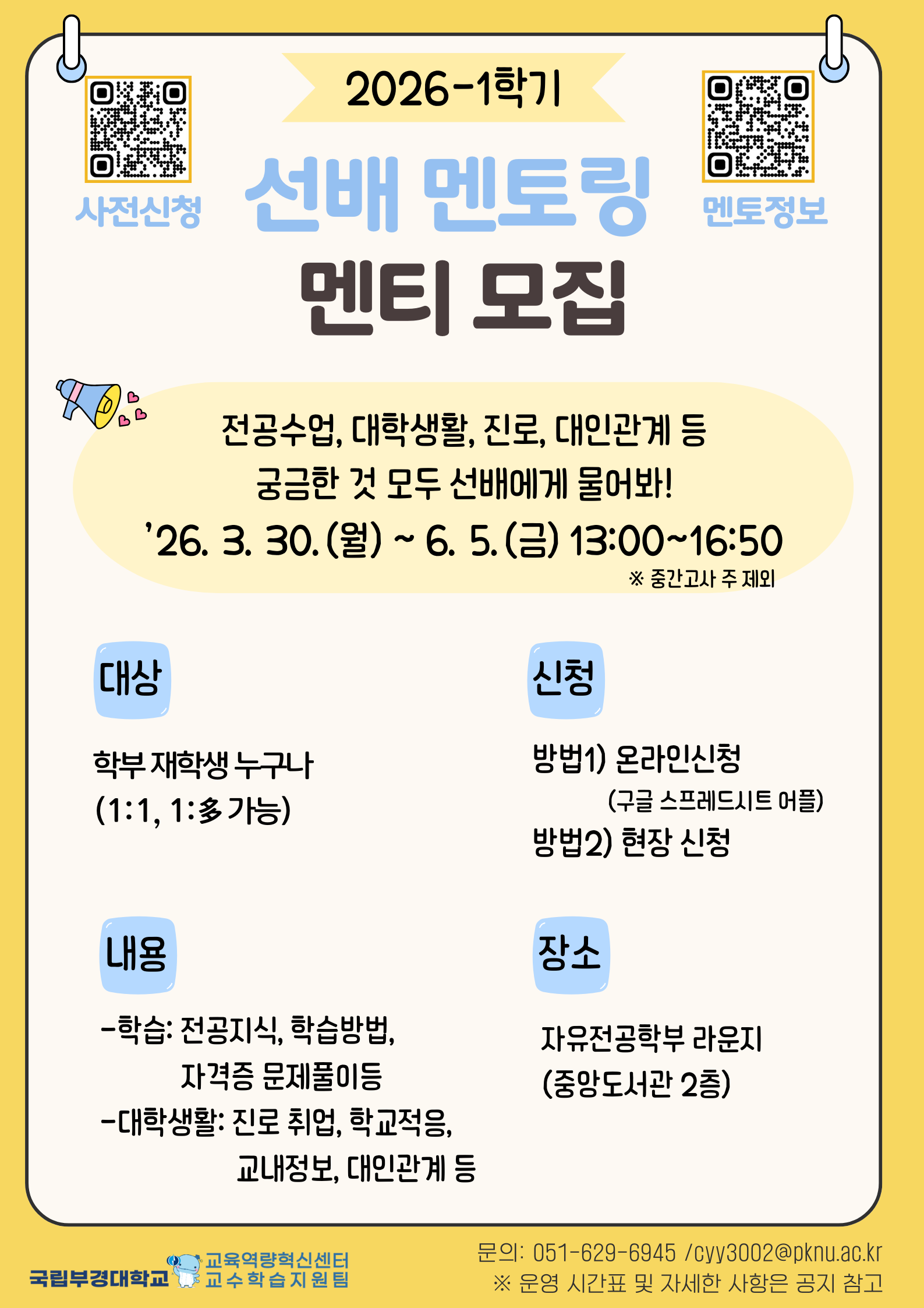 [교육역량혁신센터] 2026-1학기 "선배 멘토링 프로그램" 신청 안내 교육역량혁신센터에서 2026-1학기 “선배멘토링 프로그램”을 아래와 같이 운영하오니 멘티 신청을 희망하는 학생들의 많은 관심과 참여 바랍니다. 가. 개요 1) 사업내용: 학과별 우수 재학생을 멘토로 선정, 자유전공학부 라운지에 상주하며 멘티를 대상으로 학업 및 대학생활에 대한 상담을 1:1또는 1:多형태로 실시 2) 운영기간: 2026. 3. 30.(월) ~ 6. 12.(금)(10주간) ※ 공휴일, 중간고사 주 제외 3) 운영장소: 자유전공학부 라운지(중앙도서관 2층) 4) 운영내용: 전공학습, 학습방법, 자격증 문제풀이 등 학습 멘토링 및 진로취업, 학교적응, 교내정보, 대인관계 등 대학생활 전반에 대한 멘토링