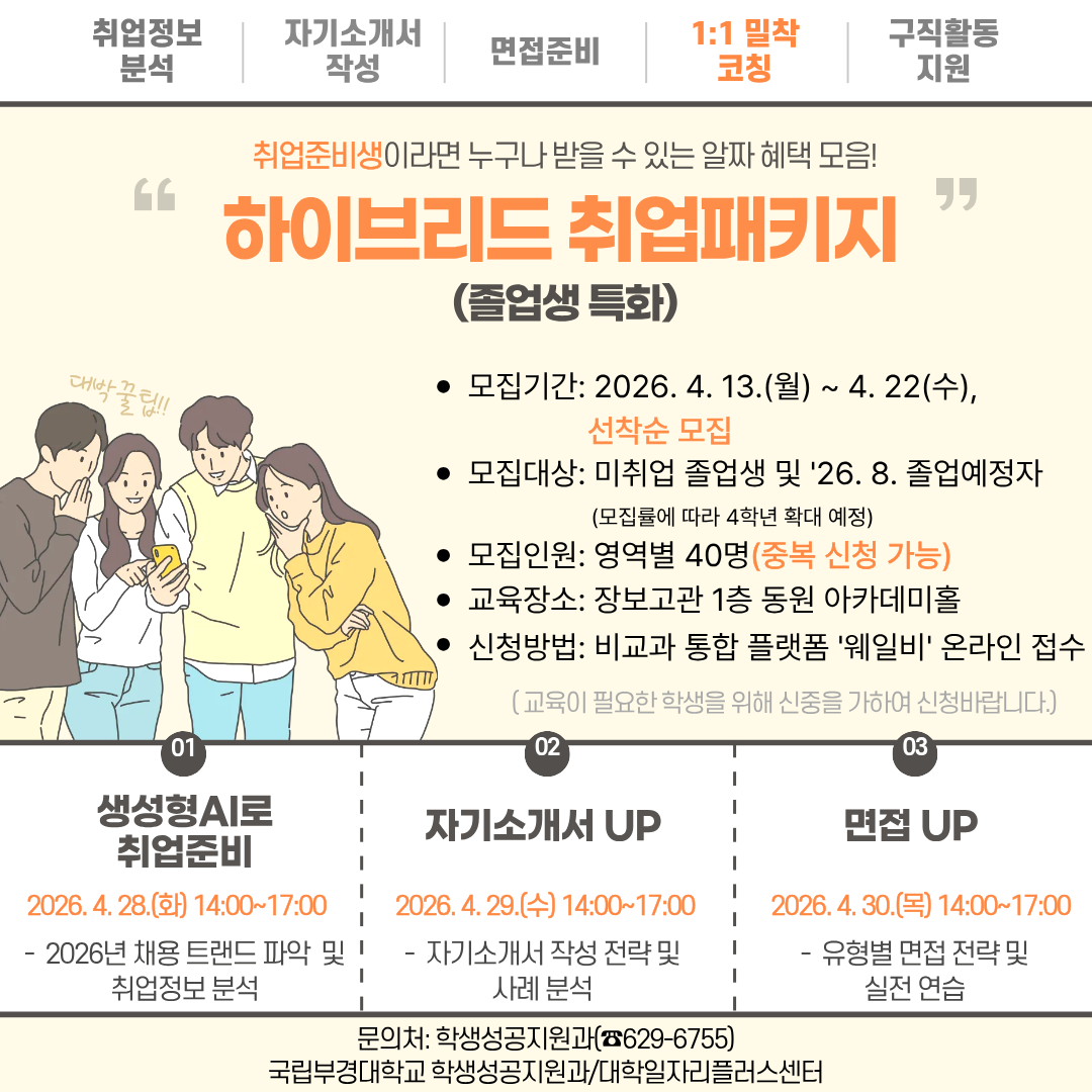 2026년 대학일자리플러스센터사업「하이브리드 취업패키지(졸업생 특화)」특강 참여자 모집 홍보 대학일자리플러스센터에서 직무 분석 및 채용 트렌드 파악을 통해 입사서류 및 면접 준비 스킬을 향상시키고 개인별 구직역량 강화를 위한 하이브리드 취업패키지(졸업생 특화) 프로그램을 실시하오니, 취업 준비 중인 미취업 졸업생 및 졸업예정자(’26.8월)의 많은 관심과 참여 바랍니다. 가. 교육내용: 하이브리드 취업패키지 프로그램 나. 지원자격: 미취업 졸업생 및 졸업예정자(’26.8월) ※ 모집 상황에 따라 대상 범위(4학년) 확대 예정 다. 신청기간: 2026. 4. 13.(월) ~ 4. 22.(수) 선착순 모집 라. 교육일정 및 장소