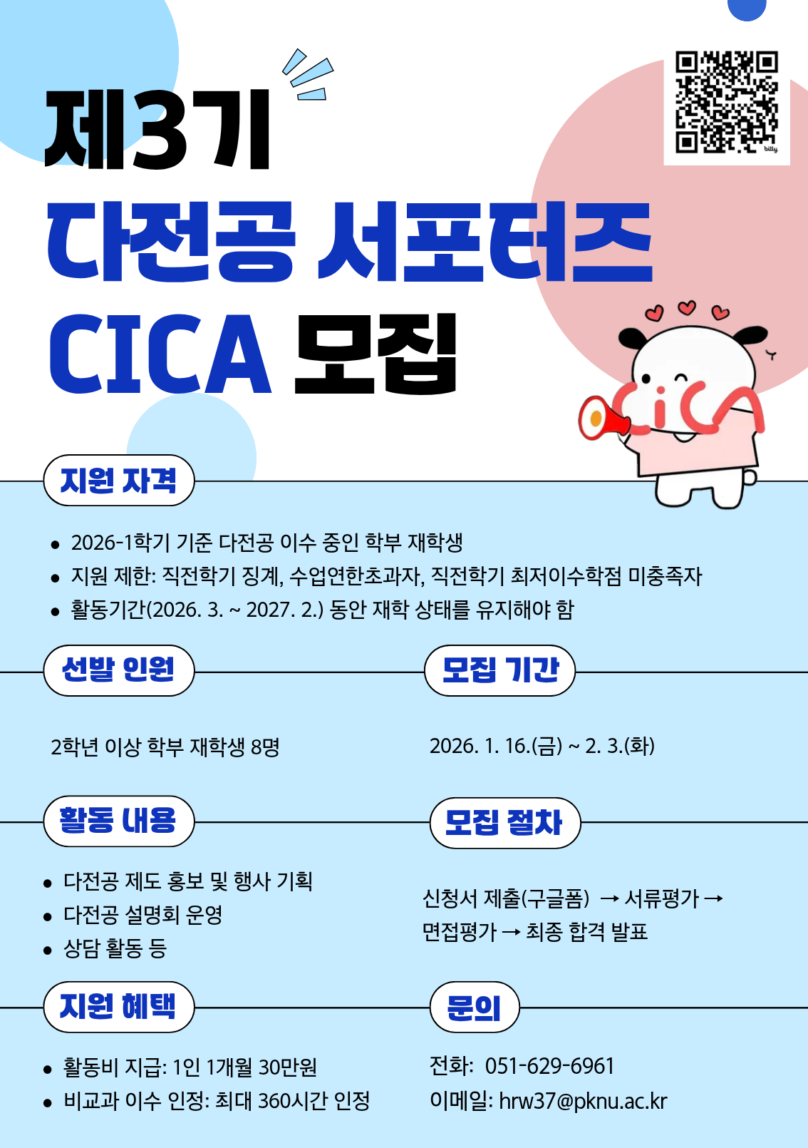 제3기 다전공 서포터즈(CICA) 모집 홍보 다전공 제도의 체계적인 홍보 활동을 위한「제3기 다전공 서포터즈(CICA)」를 모집하오니 많은 관심 바랍니다. 가. 서포터즈명: 제3기 다전공 서포터즈(CICA) 나. 선발인원: 학부 재학생 8명 ※ 지원 제한: 최저이수학점(12학점) 미충족, 직전학기 징계, 수업연한 초과, 26년도 휴학 예정자 다. 활동기간: 2026. 3. ~ 2027. 2.(총 12개월, 1개월 30시간 이상 활동) 라. 활동내용: 다전공 제도 홍보 및 온·오프라인 설명회, 학생설계전공 교육과정 설계 공모전 참여, 운영부서 업무 지원 등 마. 활동지원: 1인 1개월 30만원 장학금 지급, 비교과 이수시간 최대 360시간 인정 바. 모집기간: 2026. 1. 16.(금) ~ 2. 3.(화) 15:00 사. 신청방법: 웨일비 또는 학사행정정보시스템을 활용하여 신청
