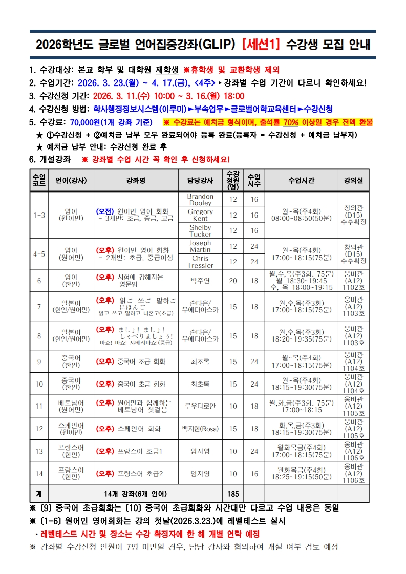 글로벌어학교육센터가 운영하는 <2026학년도 글로벌 언어집중강좌(GLIP) 세션1>을 안내하오니 많은 관심 바랍니다.