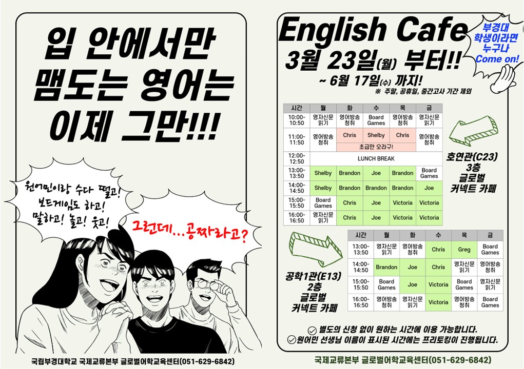 2026-1학기 글로벌 커넥트 카페(GCC) 운영 안내(글로벌어학교육센터) 글로벌어학교육센터는 재학생들의 영어회화 실력 향상을 위하여 2026-1학기 글로벌 커넥트 카페(GCC)를 운영하오니 많은 관심 바랍니다. 가. 운영기간: 2026. 3. 23.(월) ~ 6. 17.(금), <13주> ※ 주말, 공휴일, 중간고사 기간 미 운영 나. 참여대상: 학위과정 재적생(외국인 유학생 및 휴학생 포함) 다. 운영장소: 글로벌 커넥트 카페(카페1: 호연관(C23) 3층, 카페2: 공학1관(E13) 2층 라. 운영내용: Free Talking Class(외국인 강의초빙교수 참여 영어회화) 및 자율적 영어 카페 이용 마. 혜 택: 비교과 수료증 발급 및 우수 이용자 소정의 선물 지급