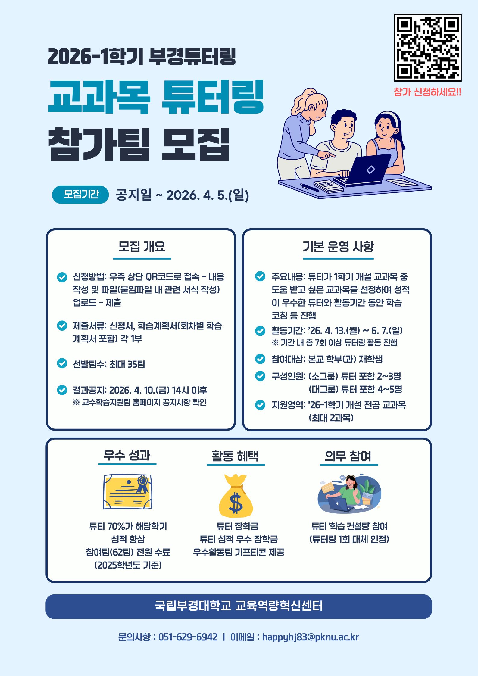 2026-1학기 부경튜터링(교과목 튜터링) 참가팀 모집 안내 교육역량혁신센터에서 2026-1학기 부경튜터링(교과목 튜터링)을 아래와 같이 운영하오니, 관심있는 학부(과) 재학생은 확인 바랍니다. 1. 운영 개요 가. 활동기간: 2026. 4. 13.(월) ~ 6. 7.(일) 나. 참여대상: 본교 학부(과) 재학생 팀(튜터 1명, 튜티 1 ~ 4명) 다. 주요내용: 튜티가 ’26-1학기 개설 교과목 중 도움 받고 싶은 교과목을 선택하여 성적이 우수한 튜터와 활동기간 동안 학습 코칭 등 진행 라. 지원혜택: 튜터·튜티 장학금 지급 및 우수활동팀 기프티콘 지급 2. 신청 안내 가. 신청기간: 공지일 ~ 2026. 4. 5.(일) 나. 신청방법: 팀별 해당 링크(https://forms.gle/TpScbtrTi2s6yc4s6)로 신청 서류 제출 다. 신청서류: 참가신청서, 학습계획서(회차별 포함) 1부(붙임2 서식) 라. 선발팀수: 최대 35팀