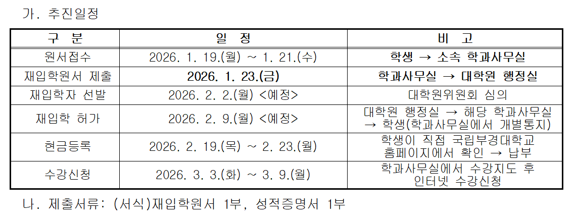 2026학년도 전기 일반대학원 재입학 일정을 아래와 같이 안내합니다.