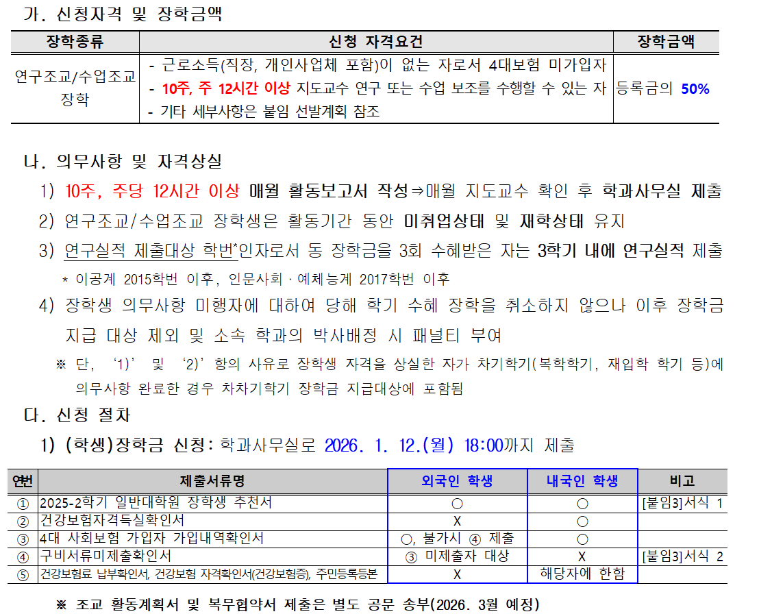 | [일반대학원] 2026-1학기 대학원 연구조교/수업조교 장학생(재학생) 추천(~1/12) | |||